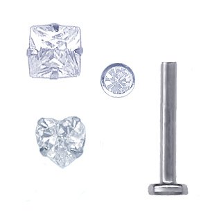 18 gauge, 5/16 inch long, 316L surgical stainless steel post is with small 1/8 inch (3mm) diameter CZ square top, one 3mm diameter prong set heart and one 2mm round jeweled top. Longer and shorter posts available upon request. Post is internally threaded, which means the threads stick out of the ball and screw into a hole in the labret stem.